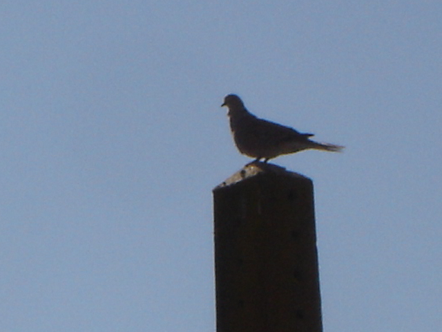 La tórtola de la foto contempla el paisaje desde lo alto de ese poste de madera. Seguro que el tórtolo no anda lejos.